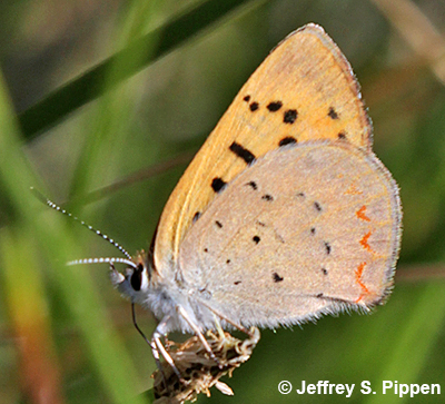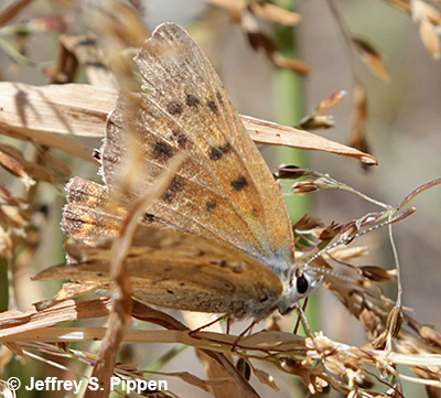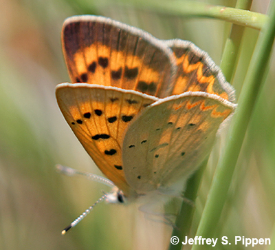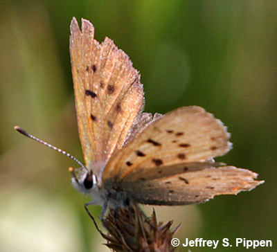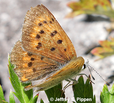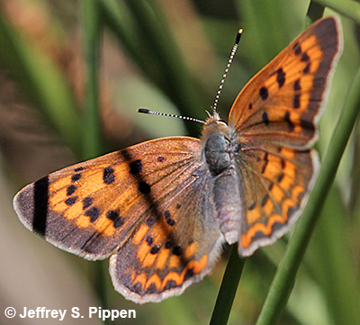 #5520 Purplish Copper (Tharsalea helloides) Near Mt. Baldy, Missoula Co., MT 16 Sep 2013 Above, females have bolder black spots among an oranger background. |