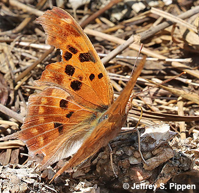 Question Mark (Polygonia interrogationis) Brumley Nature Preserve, Orange Co., NC 11 May 2023 This individual is imbibing nutrients from River Otter scat. |