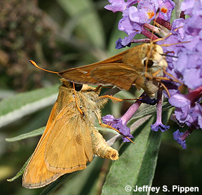 Sachem (Atalopedes campestris huron) Durham Co., NC 9 Oct 2004 Male (right) "sneaking up on" Female (left) |