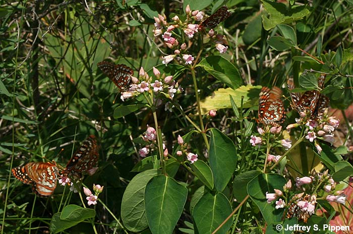 Snowberry Checkerspot (Euphydryas colon wallacensis) Davis Creek area, MPG Ranch, Missoula Co., MT 3 July 2014 I tallied over a thousand Snowberry Checkerspots this day. There are at least eight nectaring on this dogbane patch in this photo. |