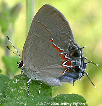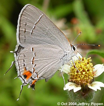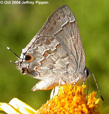 This worn Gray Hairstreak had a narrow miss with a bird or some other predator! Mission, Hidalgo Co., TX 13 Oct 2004 |