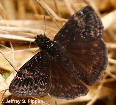 Female Wild Indigo Duskywing (Erynnis baptisiae) Duke Gardens, Durham Co., NC 10 Aug 2008 I watched this female Wild Indigo lay the egg in the photo below on Baptisia. |