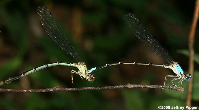 Blue-fronted Dancer (Argia apicalis) Haw River in Chatham Co., NC Male and female in tandem with male on the right, grasping the female by the head. Photo rotated 90 deg. clockwise. |