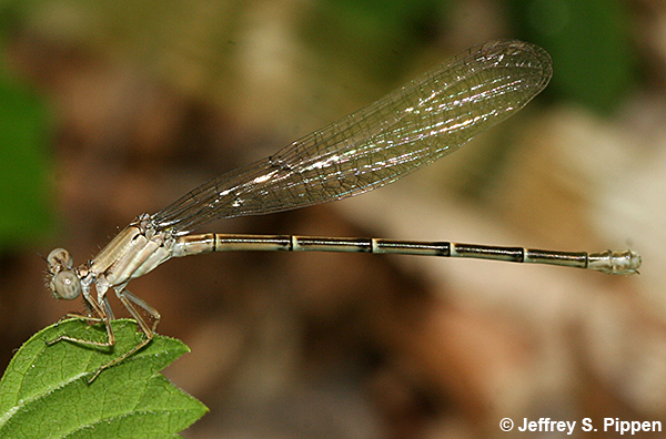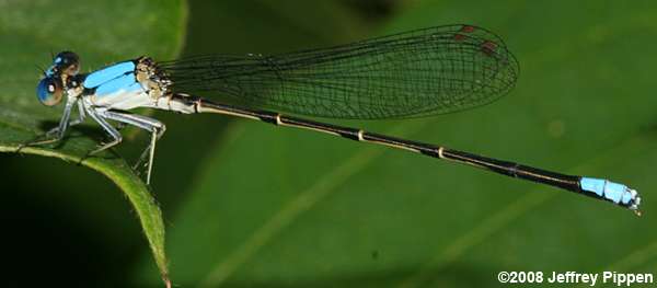Blue-fronted Dancer (Argia apicalis) Haw River in Chatham Co., NC 7 June 2008 Note that abdomenal segments 8-10 are blue, and the thorax lacks wide shoulder stripes. |