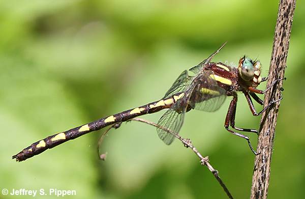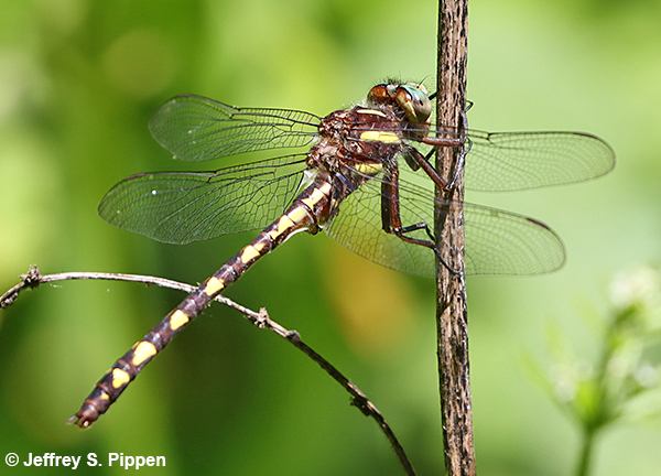 Brown Spiketail (Cordulegaster bilineata) Clay Co., NC 13 May 2006 Differentiated by the similar Twin-spotted Spiketail in that Brown Spiketails average smaller in size and the paired abdomen spots are generally all similar sized (Twin-spotted's spots vary). |