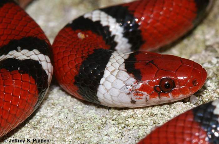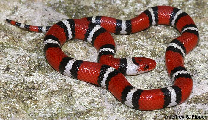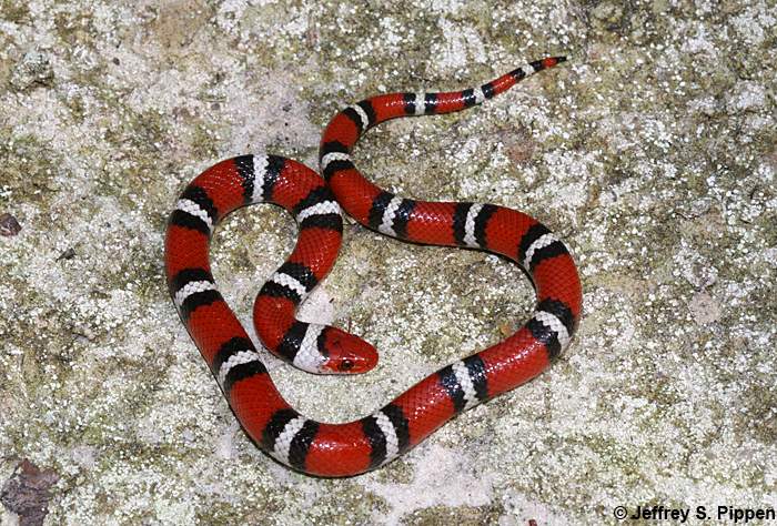 Scarlet Kingsnake (Lampropeltis triangulum elapsoides) Moore Co., NC 14 Mar 2007 Scarlet Kingsnakes can be distinguished from the similar but venomous Coral Snake by the color of its snout (red in Scarlet Kingsnake and black in Coral Snakes) and by its color pattern (red touches black in Scarlet Kingsnake; red touches yellow in Coral Snake). |