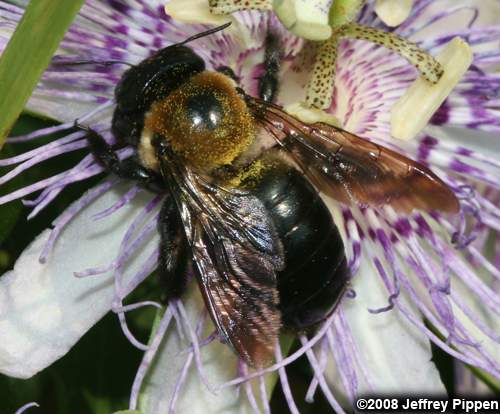 From Greek meaning wood cutters, Xylocopa carpenter bees are large and are distinguished from bumblebees by having mostly hairless abdomens.![]() |
