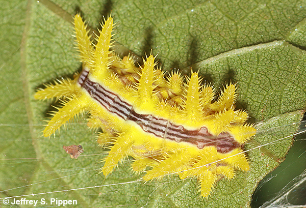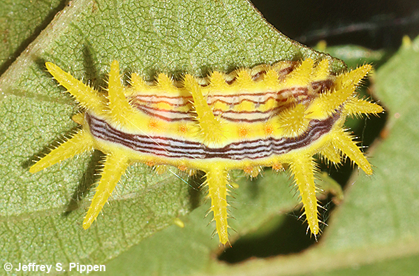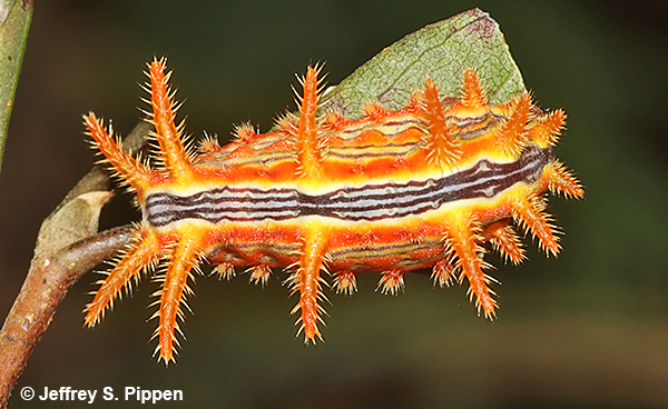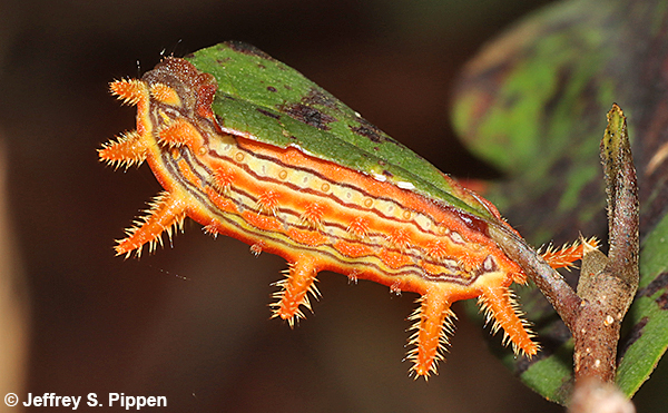 CAUTION: STINGING HAIRS!! Two-tailed Slug Moth (Adoneta bicaudata)Riparian forest in Orange Co., NC 11 Oct 2013 Different individual from above. Feeding on Southern Red Oak (Quercus falcata). |