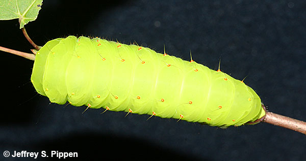 Polyphemus Moth (Antheraea polyphemus) caterpillar Durham Co., NC 29 Aug 2012 Caterpillar field guide author David Wagner describes these as "magnificent almost fluorescent green caterpillar...", a very apt description! |