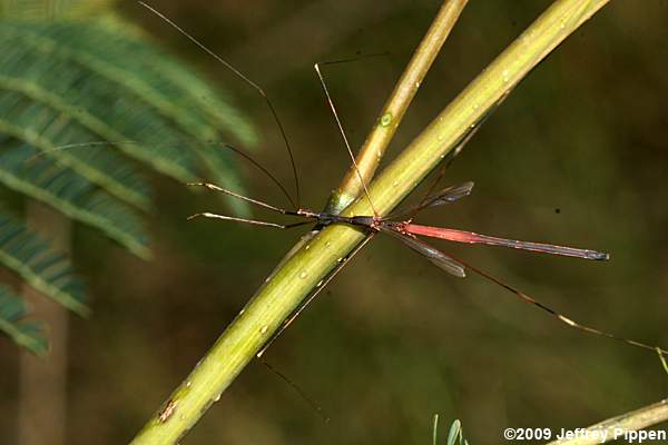 Thread-legged Bug, perhaps Emesaya brevipennis Pine woods in Orange Co., NC 2 Oct 2009 Some authorities place the thread-legged bugs as a subfamily of the Assassin Bugs (Reduviidae) as I've done here. Others elevate them to their own family, the Ploiariidae. |