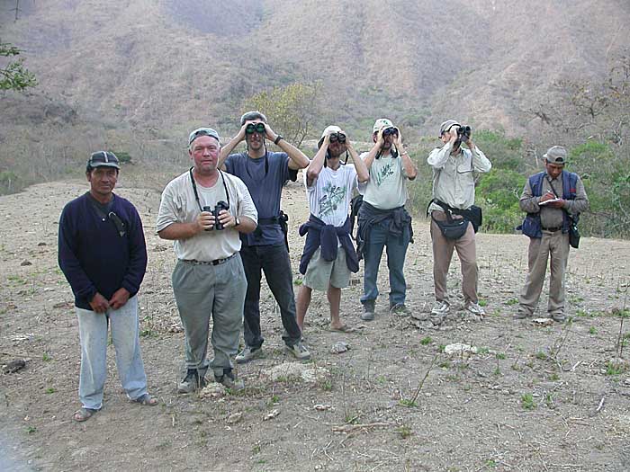 Success! We're watching a family of White-winged Guans! Unfortunately, we were too far away for me to get a photo of the guans, but here's a photo of us watching the guans. From left to right: Lina Rico (our local guan guide), Derb, Blan, David, Harry, Dan, Goyo |