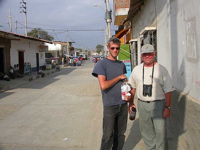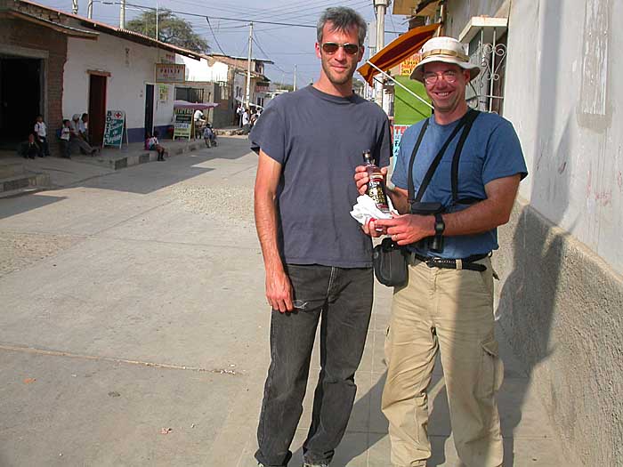 En route, we stopped at the town of Olmos to re-stock some supplies. Derb, Blan and I took this opportunity to seek out the famed "Pisco", Peru's home brew and key ingredient for "Pisco Sours"! We had to stop and ask "Hay Pisco aqui? Se vende Pisco?" in about a dozen different little shops before finding our quarry! |