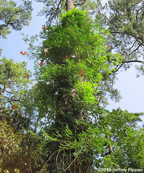 Trumpet Creeper (Campsis radicans) Durham Co., NC 2 March 2008 Trumpet Creeper grows along the ground and will climb trees (like this Loblolly Pine) into the canopy. |