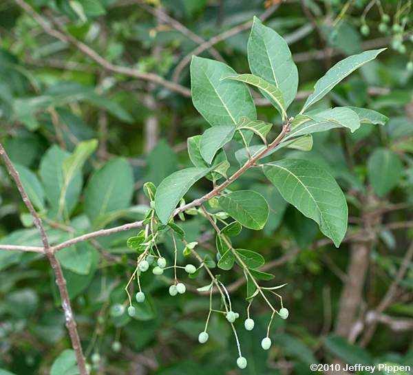 Fringetree, Old Man's Beard (Chionanthus virginicus) Durham Co., NC 28 June 2010 Beautiful displays of white flowers appear in spring, followed by ripening drupes that will become blue by fall. |