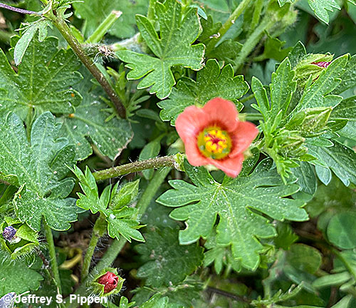 Bristly-Mallow (Modiola caroliniana) Edge of weedy lawn, Alamance Co., NC 12 Apr 2020 iPhone photo. This is almost certainly a caterpillar food plant for a local population of Common Checkered-Skippers that are indeed quite common at this spot |