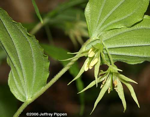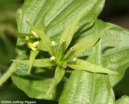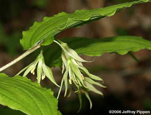 Both Radford (RAB) and Weakley's Flora state that the perianth is unspotted in Prosartes lanuginosa, but this isn't P. maculata, which has white petals with heavy spots. Could this be a hybrid between P. lanuginosa and P. maculata or a new variety of P. lanuginosa ? Clay Co., NC13 May 2006 |