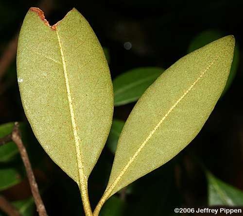 Rhododendron minus or Rhododendron carolinianum Jackson Co., NC 14 May 2006 Both species have brown punctate scaling on the lower leaf surfaces. |
