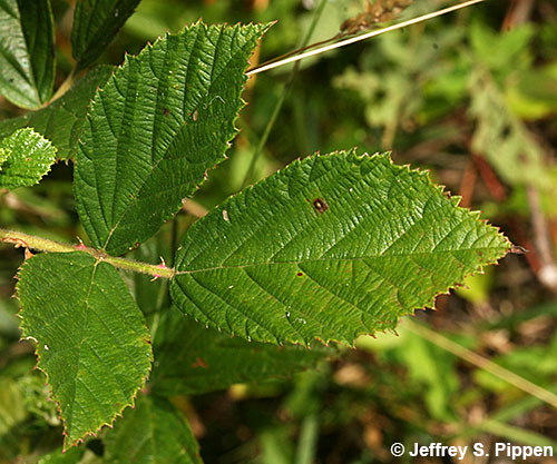 Pennsylvania Blackberry Rubus pensilvanicus Disturbed roadside forest edge in Durham Co., NC 15 June 2009 Primocane leaves have 5 leaflets and the terminal leaflet base is more or less rounded. |