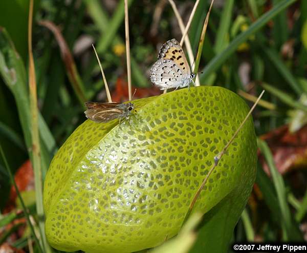 Perching on top of the plants, however, is harmless, as demonstrated by this Sonoran Skipper and Mariposa Copper! Plumas Co., CA 15 July 2007 |