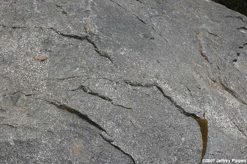 See the face in the rock? While poking along the roadside for leps, we encountered an interesting older gentleman camping by himself. He insisted on showing us an amazing thing he discovered and it could only be seen from just the right angle and from looking through your cell phone camera...yes, it was a face...in the rock... I humored the man as Bill slipped away... Near Fresno Dome, CA10 July 2007 |