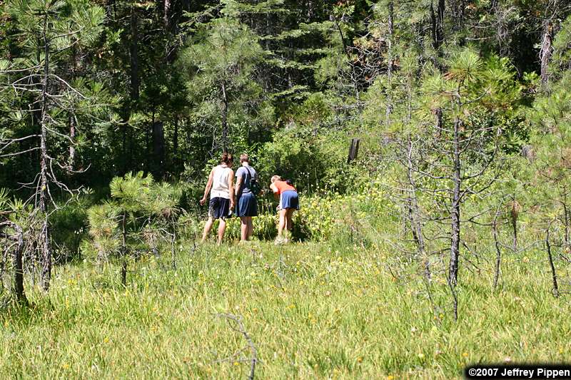 So, after driving for hours down a single-lane dirt road through the forest into the middle of nowhere without seeing another vehicle, Bill and I get out to chase butterflies, and a few minutes later we are astounded to hear voices drifting through the bog! It turns out these ladies are students at a nearby university Biology Station and had come to this area to botanize. |
