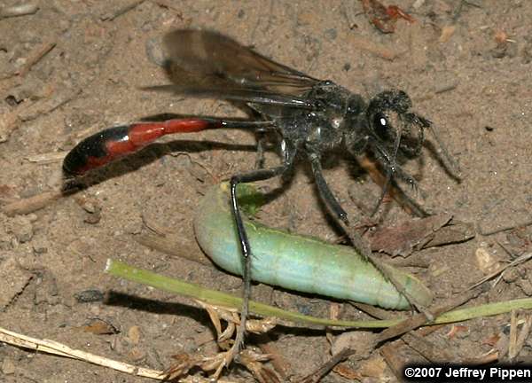 This sphecid "thread-waisted" wasp found a juicy caterpillar for lunch. Mono Co., CA 16 July 2007 |