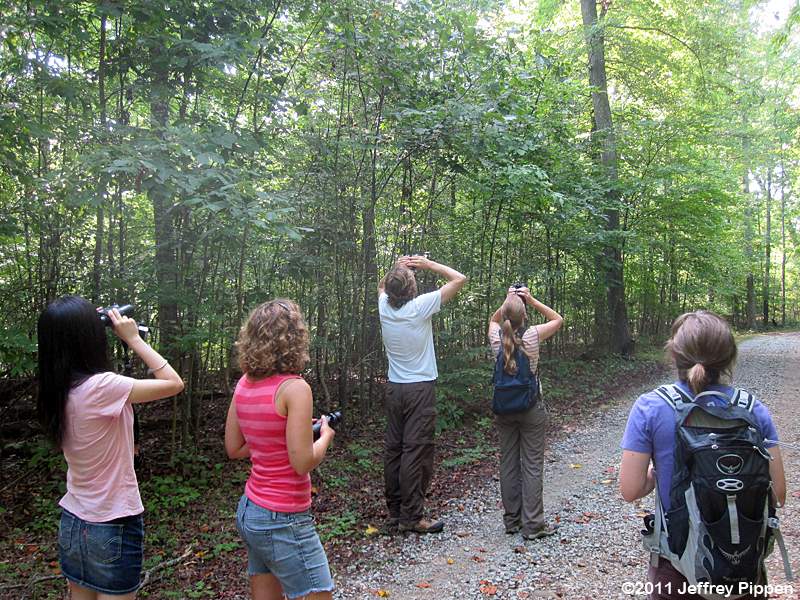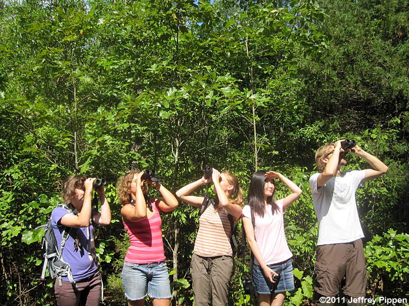 Luqin, Katie, Mike, Christina, & Liza search for chickadees in the Duke Forest. |
